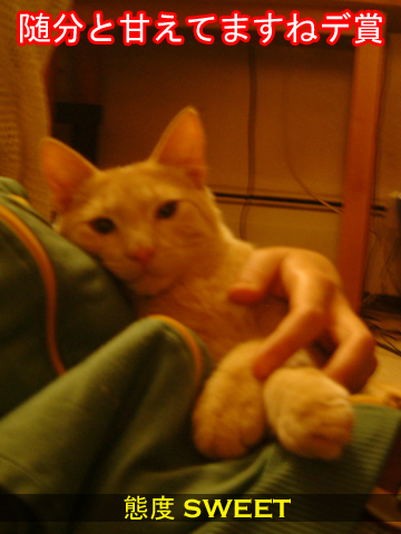 レース編みをしていると私の視界にものすごい映像が飛び込んできた。 バスケットボールの選手かのような、もしくはヴァレーボール選手かのような物凄いビッグジャンプを見せるナイジョー。アタック・ナンバー・ワンだニャン。 一瞬の出来事なので「何今の?」的。 ちゃんとしっかり観戦してなかったので、一瞬拍手するタイミングがずれた。あわてて「ナイジョー・グッド・ジャンプ!!グッド・ジョブ!ナイジョ!ナイジョ!Go-ナイジョイ!(ウーウーと口サイレンでもりあがってみた)するとナイジョーがこちらにやってきて私の顔をジーとみる。今度はナイジョの目をしっかりみて、「イエイ・イエイ・イエーイ!すごいやんか~~~!」と1人さらに盛り上がる。「もお一回やっといで!もお一回!うわ~ないじょーすご~い!」この時、自分の顔の表情と声のトーンに注意しながら。 するとナイジョーがくるっとサササっと中腰で小走りして、またまたジャンプ!そしてアタック!一回目のときより大げさに盛り上がってみた結果、またまた小走りでジャンプ!(ナイじょーもおええのに、とか思いながら)アタック大成功。3回目ともなると手馴れたもんで、私の顔をうかがうどころか、タイガー張りのゆっくりした歩き方、もしくはレッド・カーペットのセレブ的にチラッとこちらをむいてダイニングへ消えていった。 @@!恐縮です! |