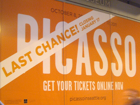めっちゃチャーミングやった。かわいいと思った。 創作過程のフィルム鑑賞。 「ほんま、おっさん?」「まさか、おっさん?」って思った。 最後の最後でほんまよかった。 9:40pm入館で時間はミッドナイトまで。 全部じっくり見終わったところで、元のスタートポイントに戻る@11:30pm。 2度見。部屋には私とピカソの絵のみ。 one on one レッスン。こんなん2度とないで。 「いいのかしら私?」、みたいな。 私はチョロチョロするんが好きなので間近も間近、細部まで覗き込み。 MYボールペンでピカソの格言書き写してたらセキュリティーの人に鉛筆渡された。 いつも美術館のセキュリティーにひっかかる。 帰ってきて流行の「中国の」出前一丁(味噌)とツナサンドウッチを作る。 ピカソ展はお腹がすく。 2011.01.14 Fri 16:23:43
