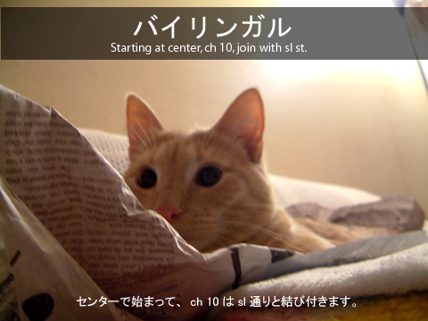 ええ、私はクロッシェターですから、英語のでもしますよ。 ・・・・・・・・・・・・・・・・・・ ・・・・・・・・・・・・・・・・・・。 そうなんですよ、英語の解説が読めない自分にショックでね。レース編みの自信すらなくなってしまったくらいです。数日間集中トレーニング開始。初めは英語を日本語に翻訳したものなどで勉強してましたが、これがまた非常にややこしい。開き直りで英語をそのまま飲み込むことにしました。声をだして読んだりもしました。気付きました。英語版、私の普段使ってるような言葉やった・・・・・・><; 英語のレース編みの解説はブロークンイングリッシュ。 ルー大柴の英語がわかる貴方ならできます。 みんなで、クロッシェー、ジョインしようよ、みたいな。 例文①:Starting at center, ch 10, join with *sl st. 翻訳:センターで始まって、ch 10はsl通りと結び付きます。 私的:スターティング@センターで、Ch10、そしてSl stでジョイン。 *Sl St=Sl通り。それってばもおレースの目は道です! 例文②:Make sc in next 15 sc, ch 4, in ch-2 of shell make (2 dc, ch 2) 3 times and 2 dc. Ch 4, skip 1 sc. Repeat from * around; join. 翻訳:*シェルのch-2で、次の15のsc(ch 4)のscを3つの時間と2つのdcを作らせ(2つのdc、ch 2)てください。Ch 4は、1つのscをスキップします。繰り返しますまわりで*;出会ってください。 *この出会ってください、がめっちゃ好き。はい出会います、みたいな。 私的:次の15scにMake sc 、んでCh4。シェルのCh2に2dcとCh2.それを3回、そして2dc。 Ch4んで、スキップ1sc。それを繰り返す。そして出合ってください、みたいな。 英語ヴァージョン・フリーパターン、一枚(初作品)完成。 英語のん、おもろい。Cracking Code. 2010.07.24 Sat 16:28:07