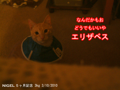 E-Collar Day 7. のびのび過保護・手作りの巻き。共存。 自殺サークル(DVD・園子温)、明日返却日。もお一回みよっと。で本日2回目。この映画前からレンタルヴィデオ屋でめだってましたが、今まで無視。見るものないから今回、無造作にこれでええんとちゃう?とジャスティン。気がのらない私だったが、ところがどっこい。全然ホラーじゃなかった。詩がええねん、詩が。詩が子供の台詞になってて、子供の口調、あのガキんちょどもの語り草がなんともいえん。ロボット的というか、淡々と言いよんな~っちゅうか。んで子供が語るその台詞(詩)の中で「ムカっ」てするところがあるんやけども。そことかも好き。例えば、抜粋。一番すきなところ。雨が乾くと雲になる。雲が濡れると雨になる。で、最終的なメッセージは勝手に生きろ。これが一番観るものだったらしい。(なるへそねぇ~) ローリー(寺西)が途中で出てくるのにも笑った。本名:鈴木宗夫(自称ジェネシス) ♪この世は人生ぇ~ジグソーパズルぅ~♪ 基本的にこの映画、意味がわからん。ナンセンス。JOKE=人生=ARTみたいな。であれはなんだったの?あれは、どうでもいいんちゃう?そこは私のポイントじゃない。 。。。。。。。。。。。。。。。。。。。。。。。。。。。。。。。 去勢手術その①ブルーなエリザベス (写真あり) 去勢手術その②物好き (写真あり) 去勢手術その③発明王 (写真あり) 去勢手術その④噂のバニー (写真あり) 去勢手術のその後⑤鈴 (写真あり) 去勢手術のその後⑥かぶり (写真あり) 2010.03.10 Wed 19:01:50