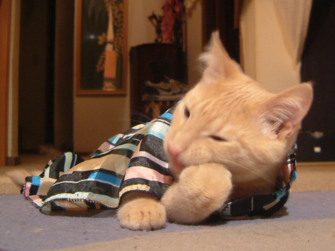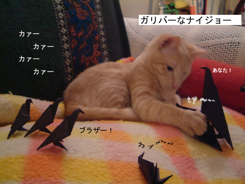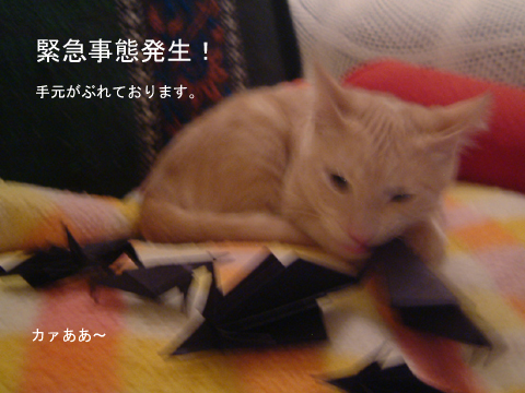 ナイジョー今日で◎4ヶ月。奇跡。どうもありがとう。毎日がドキドキ。ドキドキすぎてリコーダー(どなどな)の呼吸法もだんだん整ってきてます。集中モーメント。スタッカートの練習。拭いてる途中にがまんでけんくなって中断。ドナドナにスタッカート入れて吹くようなところなんてなかったッ。しーん。自嘲。リサイタルが決まりましたら、また発表します。ありがとうございます。おお心の友よ。 そんなことは置いといて。 今日ハッとしたこと。(グッとはこんかった。ごめん俊ちゃん。) 淋しすぎて只今折り紙に夢中。 ●三つ折ったら、また三つ折って、なんやったら10とか余裕でおれる。 ○後三つで12。12やったらもお15やん。早いもんやで。 ●そんなんやったら20とかは欲しいわ。 ○20代は中途半端や。30代とかすぐそこやん。 ●45とかめざして。50とかいく? ○もおそこまでいったら、100折りたいわ。 ●100まで行ったら1000とか行こうやってなるけど、ソレいらんわ。 ○なんしか5本の指すぎたらいっぱい(と数える)みたいな。原始的。 ●結局自分も何枚おったかわからん。 ○ええんちゃう、それで。イッパイ折った!みたいな。 ●300ぐらいでおわってもええけど。 ○150とかでもええわ。 ●冷静に見て、画用紙たらんわ。100は行くと思うけど、微妙やなぁ。 ○っていうかすでに大群。なんしかイッパイ折りたいだけ。 昨日ブログに飼い主が飼い猫にスウィーツのおすそ分けをする、という話を書いたんですが、ナイジョーの弟(デクスター)はピザが大好きらしい・・・ 。( ゜ ▽ ゜ ;)☆ へっ!? 私は言葉を失った。ナイジョーを引き取ってよかった。ごめんデクスター。君も今日で4ヶ月。これまた奇跡なり。 2010.02.10 Wed 17:53:06