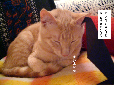 しゃがんんで、タッパーを探しているときのこと。ナイジョーが私の肩に乗ってきたので、乗せたままごそごそ。見つけた。立った瞬間、おでこオモッキリ突き出てるまな板の角でうった。☆☆☆ あれは久々に痛かった。泣くかと思った。5分後ぐらいに氷を袋にいれて冷やす。いちいち持っとくのだるいんで、ピン止め(大)でとめてみた。なかなかいい感じにぶら下がってる。両手がつかえる自由。本が読める。ナイジョー、不思議そうな顔で私の顔を覗く。爆笑してもた。「これやろ~。メッチャ痛かったっ。は!ナイジョーも横おったやんか!」内出血してへんだけまだ良かった。でもスンゴイ盛り上がってる。 ナイジョー明日で4ヶ月。食事の量を調節。Reconsideration。何!4ヶ月で3.5キロの猫ちゃん発見。見た目OK。結構スリム。別の猫も発見。4ヶ月で体重は標準範囲。でもなにこのお腹!すでにメタボ。生クリームやアイスクリーム、カスタードがお気に入りだそうです。( ̄_ ̄|||) お菓子も食べますとのこと。( ̄_ ̄|||) チーズケーキもおすそ分け。( ̄_ ̄|||)ちょっとだけおすそ分け。ってほぼ毎日やん!( ̄_ ̄|||) 極めつきは、ポトス(観葉植物)は猫には良くないそうですが●●ちゃんは大好きです葉っぱをムシャムシャします。( ゜ ▽ ゜ ;)☆死ぬで! 2010.02.09 Tue 17:29:19