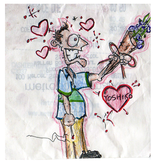 今日のブランチは久しぶりのマフィンとコーヒー。マフィンはアップルマフィンでコーヒーはラテ。アップルマフィンが美味しかったのなんのって。夕食は昨日の残りと豚肉の豆板醤焼き。ご飯は黒胡椒・いりゴマ・玉子・ねぎ。これまた最高に美味しかった。一人では絶対に作らないメニュー。 夕食後、こないだ日本に帰った時の写真をジャスティンとみる。大笑い。アメリカ人もびっくり。なんでこんなに私の家族は個性がつよすぎるのか。そしてなんとセンスのいい家族なんだろうと改めて思った。父の還暦の写真撮影の様子が思い出されて、これまた大爆笑。母のパジャマはかなりやばい。いかにもこの写真撮影のために選びましたと嘘をついてしまったくらい。 今日、ジャスティンの家に私のペインティングが飾られた。9.11の絵。久しぶりに見る自分のペインティングに「私って凄いんじゃないの?いいよねぇ、これ。」と心がワクワクしてしまった。 昨日ジャスティンから言われたこと。「今までの僕のスケッチブックに色を塗ったり、君のイラストを描き加えたり、僕にかまわずなんでも好きなようにやってもいい。」ということで早速開始。で、思ったこと。「ジャスティン絵上手いなぁ~~~。めっちゃ勉強になるわ。それにしても上手いなぁ~」と首をふらずにはいられない。そういうジャスティンも私のペインティングをナマで見て首を振りまくりだった。 ジャスティンがイラストを描く。ガンをもった女性のイラスト。「この続きどうしようか?デビル?ジーザス?うーん・・・君?この女性が君に嫉妬してる。だって僕の彼女だから。」私「そうやなぁ、鏡に映ってる過去の自分を撃ち殺した。もしくは私。だって私ってばSO FINE。」 ああ、私の父を筆頭に、私も彼も自分の事が好きでたまらない人間。 2007.08.17 Fri 19:42:05